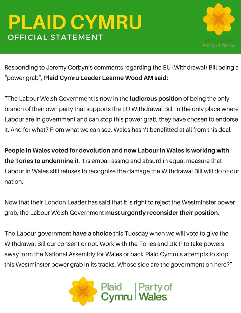 "What they are doing is taking powers from Brussels that then ought to go to Scotland, Wales and English regions and instead hoarding them in Whitehall,"Plaid Cymru said the Welsh Government's position was "ludicrous".
